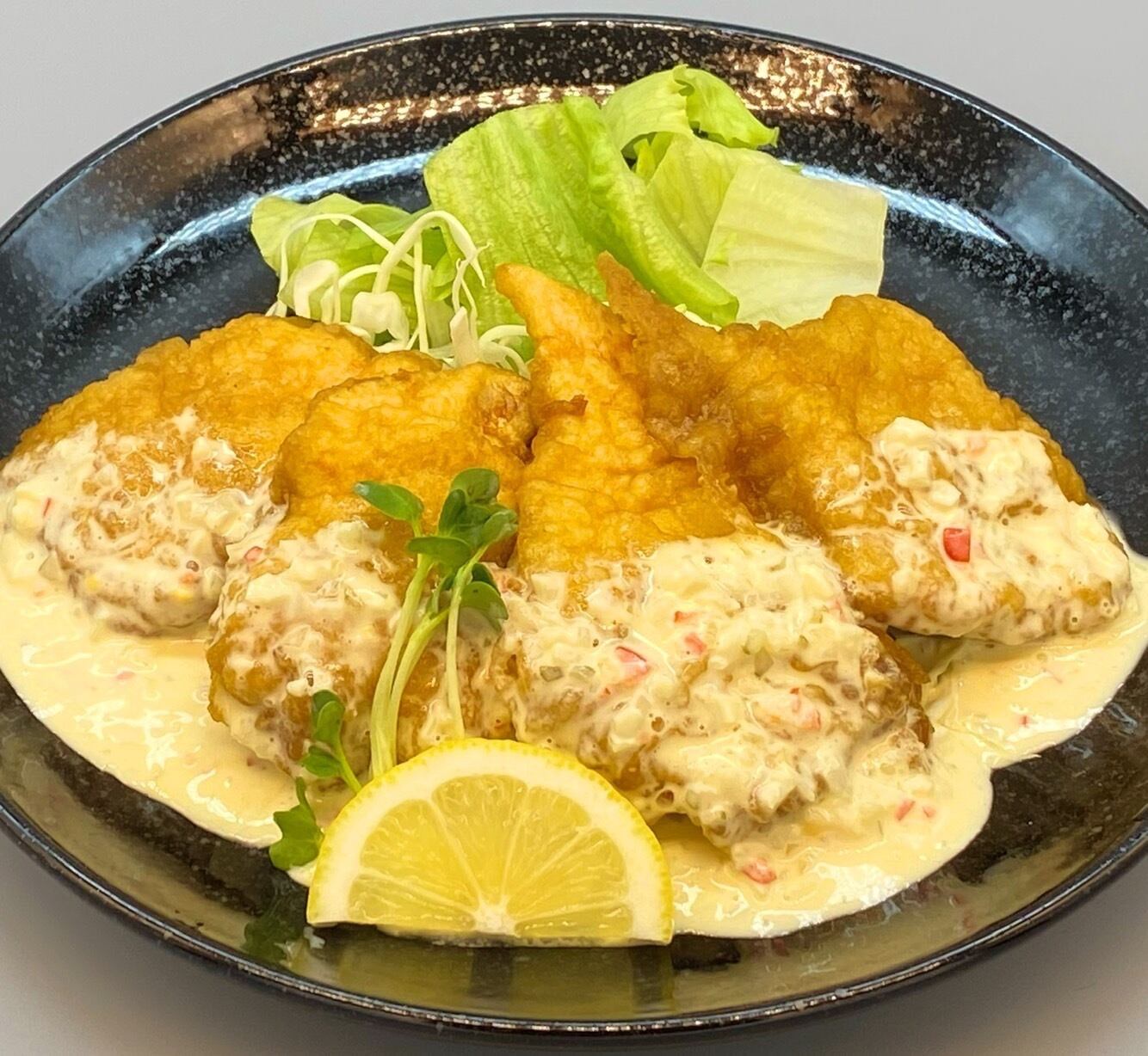 チキン南蛮に使用するのは愛知県産の鶏肉。素材の持ち味を引き出しながらやわらかくジューシーに、衣はカリッと香ばしく揚げています。